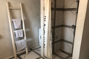 The charming covered lounge area is inviting you to relax with a view over the large pool of 9 x 4,5 meter. After your swim you can refresh yourself at the outdoor designer shower und for the sunseekers there nare two sunbeds at your disposal.